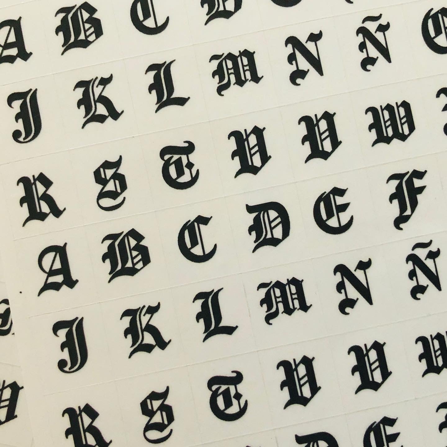 Stickers de letras góticas de diferentes colores.